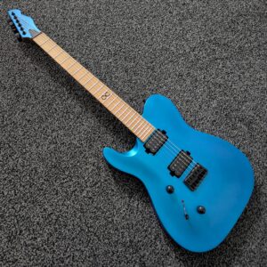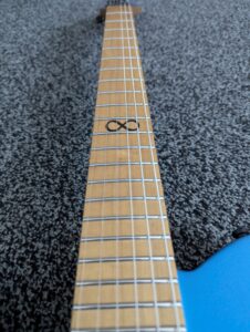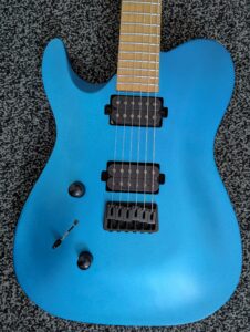 I was immediately drawn to the Chapman ML3 Pro Modern—a guitar that defied my rules. It had a reverse headstock and a body shape somewhere between a Telecaster which I hate and a Stratocaster which I’d grown bored of. But somehow, this was different. The shape just worked visually, and the vibrant hot blue finish popped beautifully against the black hardware. The fretboard, with its single, simple infinity sign, felt so clean and light. The locking tuners made things just feel so much more stable than what I was used to.